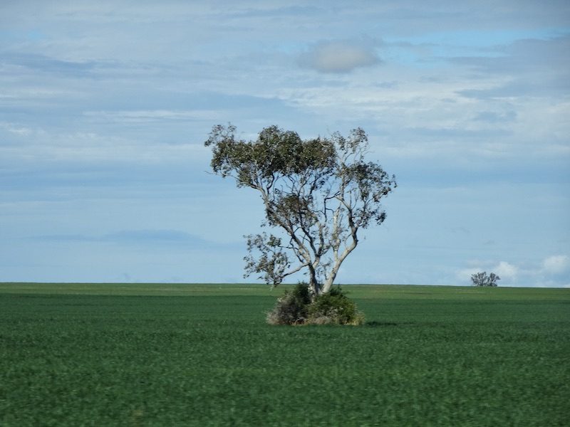 I have tried to post photos of the terrain between each of the rivers. These are not of great quality as they were taken from a fast moving car, on most occasions. The terrain changed constantly but the view was always to the far, far distance. The green fields are growing wheat, lucerne, mung beans, chick peas etc. They were huge and had huge rectangular, earthen, irrigation storage dams. The scale of the farms was just mind boggling, especially as the opposite side of the road was often quite arid. The grasses beside the road were shimmering and beautiful. We rarely saw sheep and cattle, for the height of the grass. Mornings saw crystal clear skies. By mid morning, puffy, pure white clouds began to chase one another across the horizon. Watching them was as fascinating as watching the ever changing view across the plains.