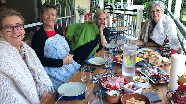Monday evening, the Gaiter Girls got together for a Christmas drink. There had been a cool gale blowing all day and by 6 pm the temperature had dropped to a cold - "20C" ! The blankets were very welcome as no one had come prepared for "winter" in summer.