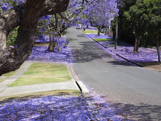 My friend Jocelyn told me of having accidently found the best street of jacarandas in Brisbane, Pring Street, Tarragindi. Of course I had to find them as well. It was a week of storms and the previous evening's accompanying wind, created a carpet of colour beneath the trees.