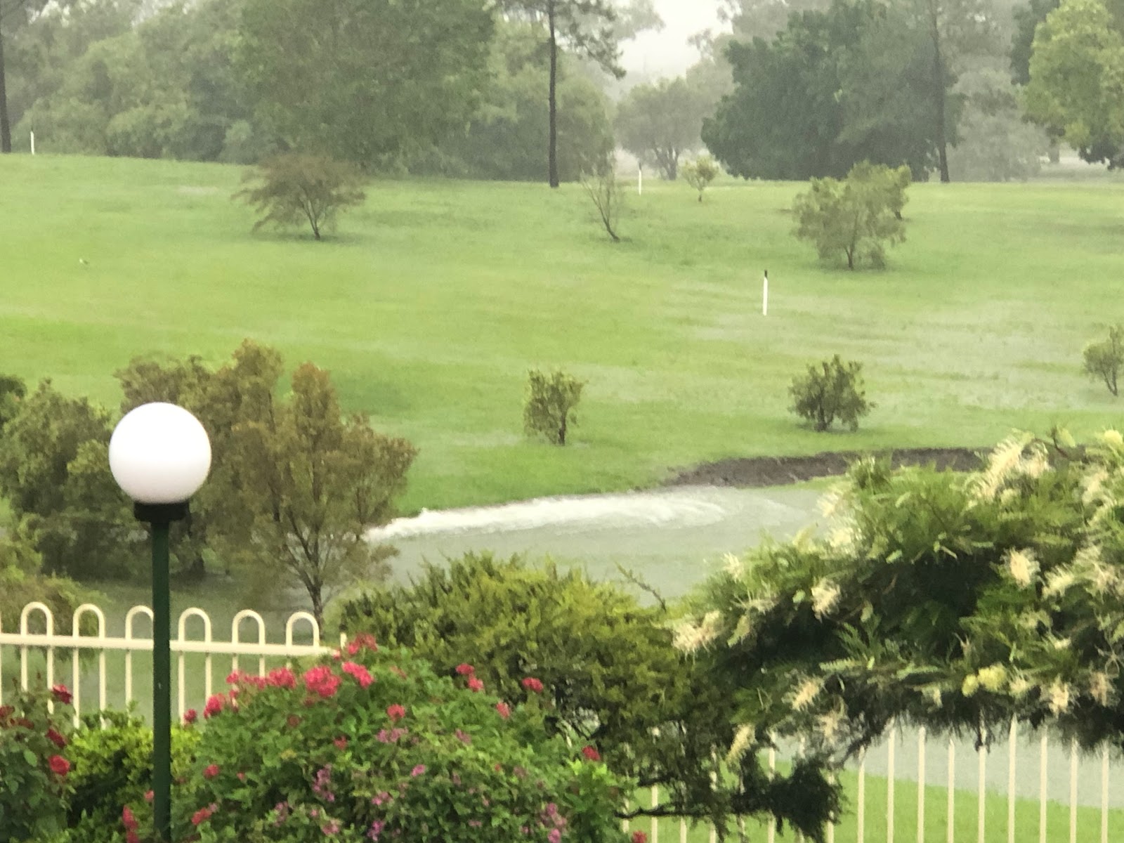 The foreground is the rain falling and unable to get away, because the ponds have risen from the flooded Albert River, on the opposite side of the golf course.